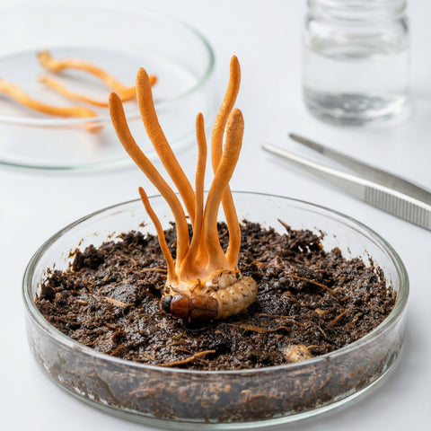 Es un hongo parásito que crece sobre insectos o larvas para sobrevivir. Aunque históricamente era escaso y costoso por recolectarse en la naturaleza, hoy en día lo cultivamos en nuestro laboratorio a través de cultivo sumergido.